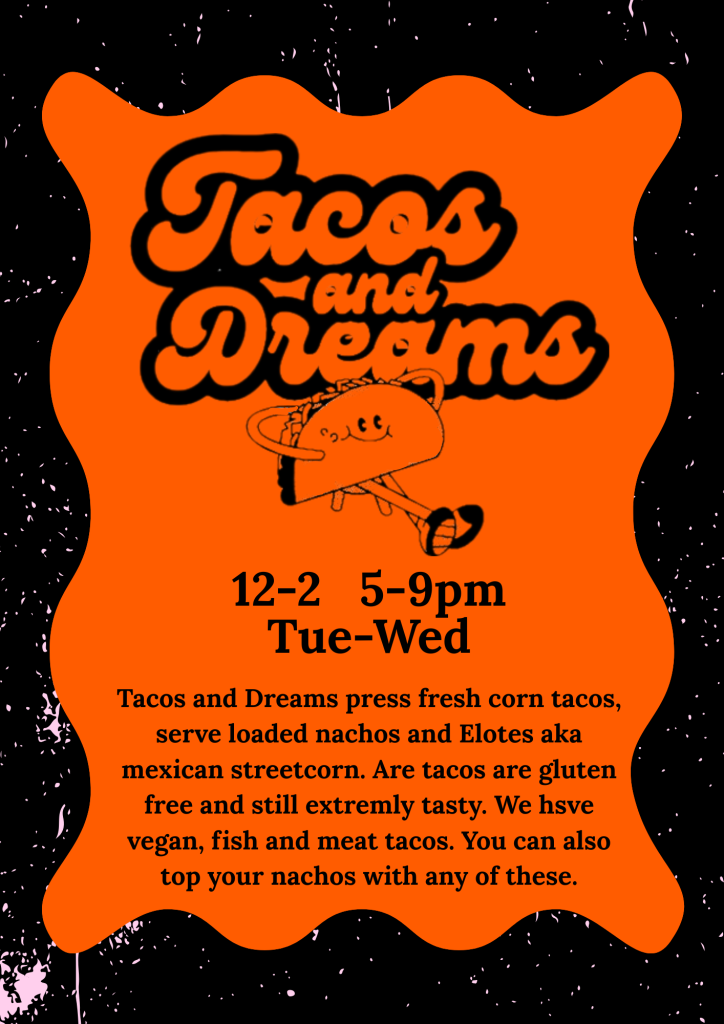 All our taco toppings are made fresh. From our banging vegan silky black beans to our classic low and slow pork belly. These 2 are our main stays but never fear tacos and dreams have other flavour of the day including chicken tinga, the Codfather, sweet potato and leek to name a few all have big, clean flavours that, Andy is always tweaking and tuning the recipe to keep it innovative, super fresh, juicy and tasty.