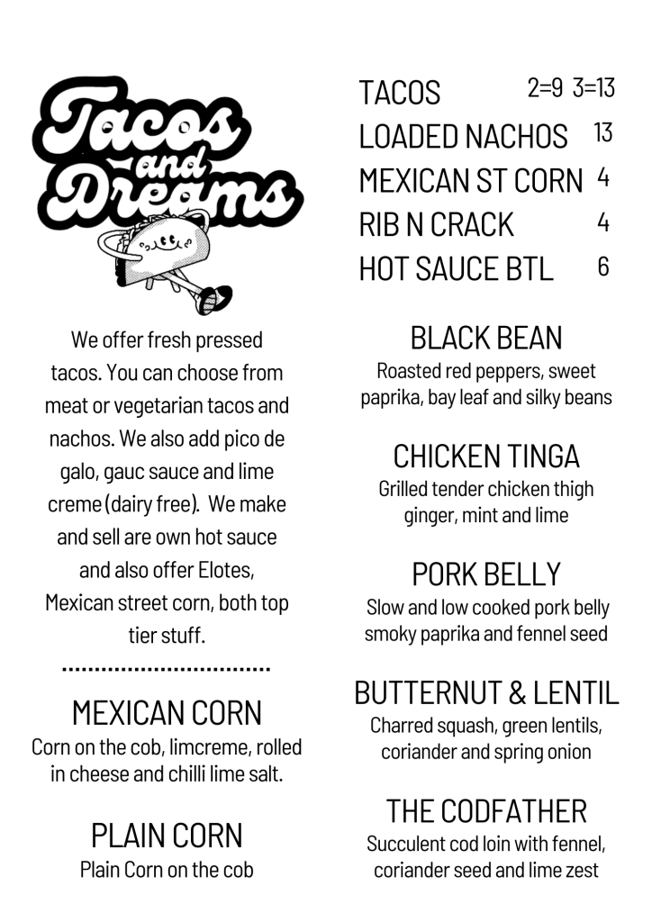 This is a menu for the 04/12/2025, Our menu changes weekly but it will always have a mixture of meat and vegan tacos. We try and pop a fish one on too.