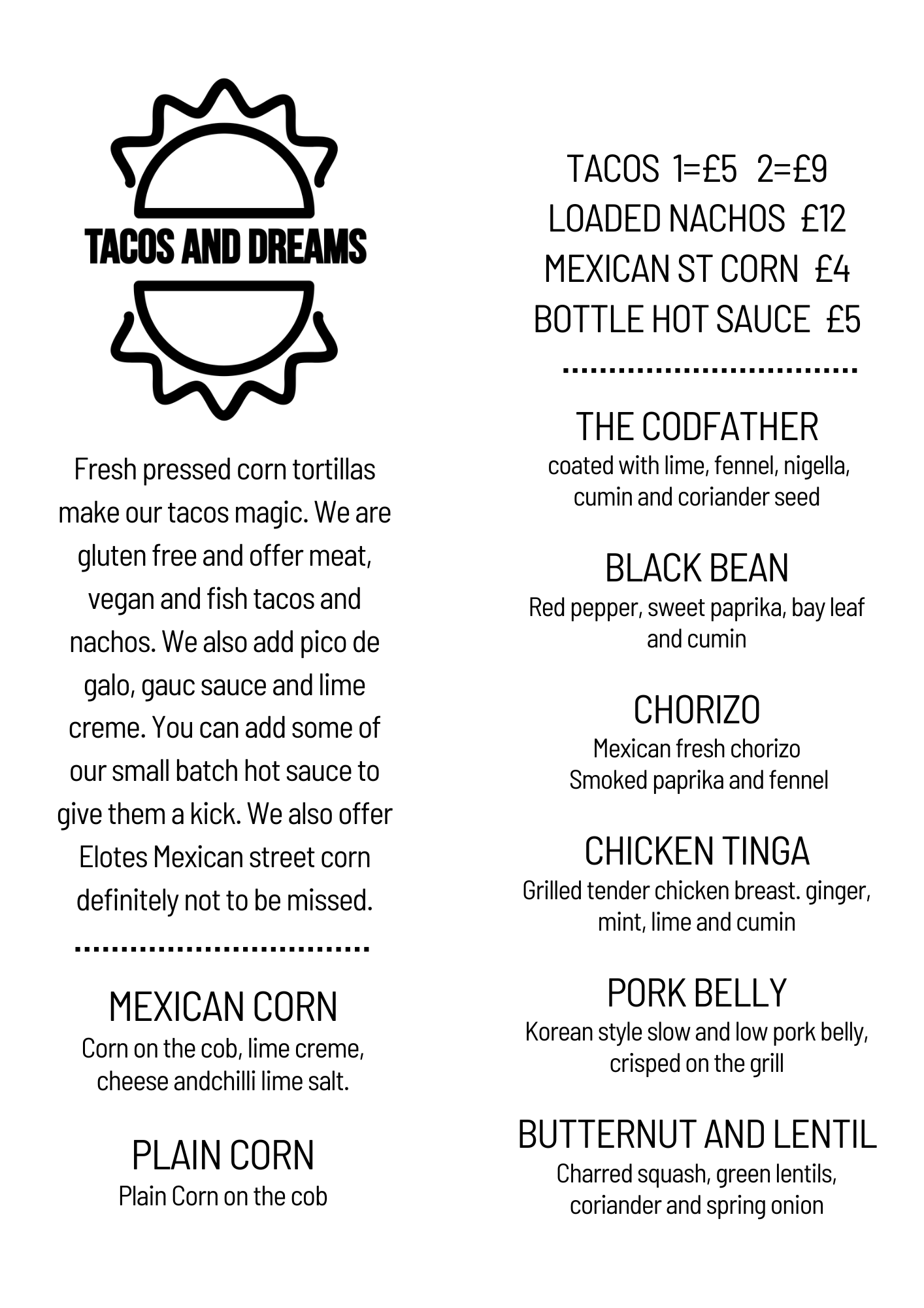 We make are own tortillas from masa so there gluten-free and cooked fresh for maximum flavour. We roll with pico de gallo, guac sauce, lime cremea and sesame seeds.
